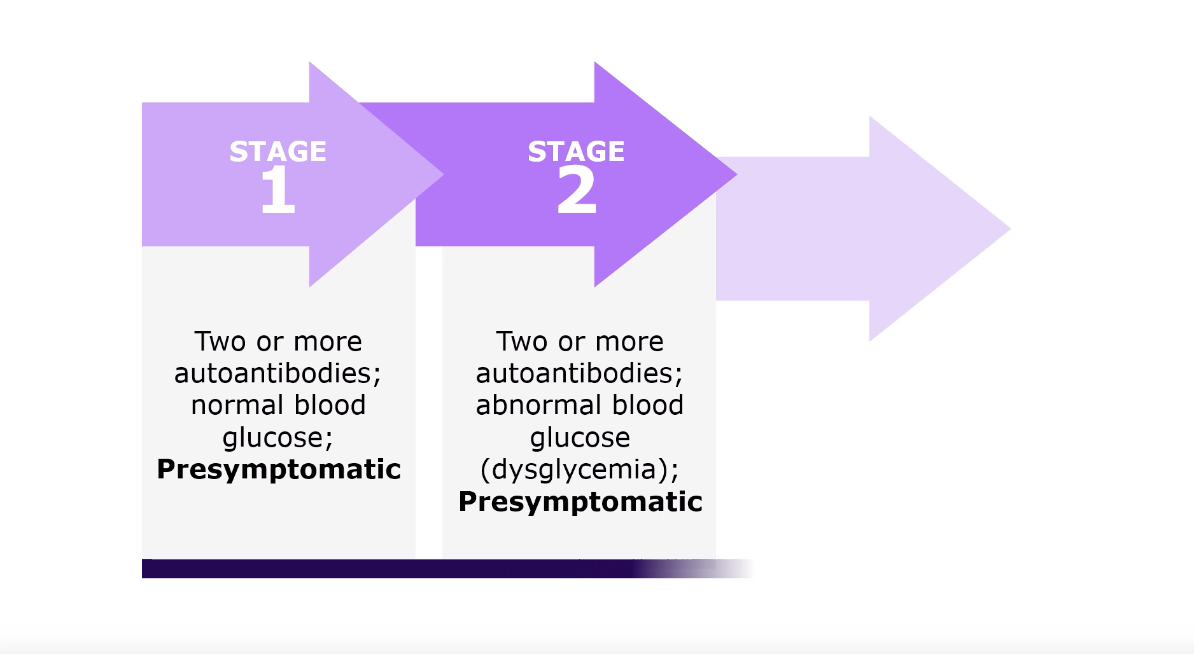 Anti-islet autoantibodies, responsible for destruction of insulin-producing beta-cells, can be detected during the presymptomatic phase (Stage 1 and 2) of autoimmune T1D. If left undetected, there is progression from the presymptomatic phase to symptomatic phase (Stage 3), which is characterized by beta-cell functional loss and hyperglycemia, which may often lead to ketoacidosis.6