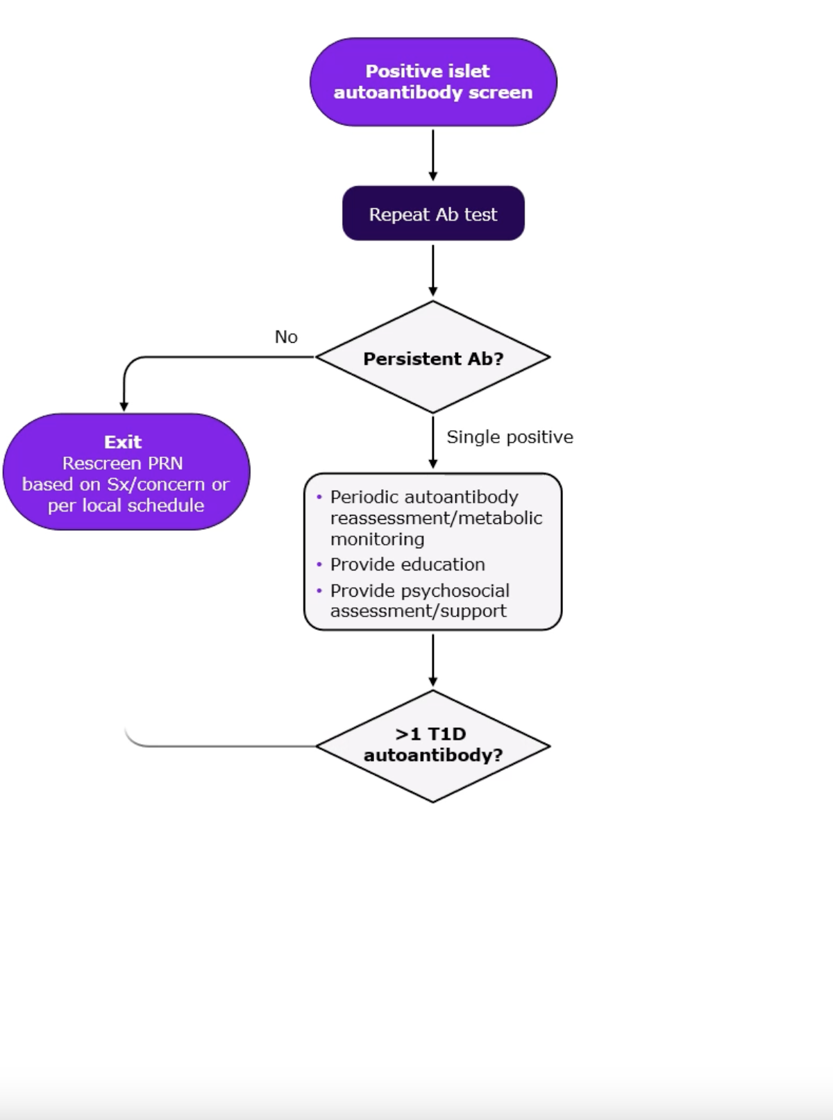 The consensus guidance published in June 2024 provides a detailed algorithm for monitoring of individuals who have been screened positive for islet autoantibodies.1 Below figure illustrates an algorithm for monitoring of people screened positive for ≥2 islet autoantibodies.1
