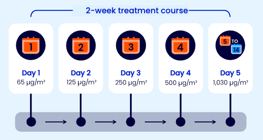 Resume by administering all remaining doses on consecutive days to complete the 14-day course1