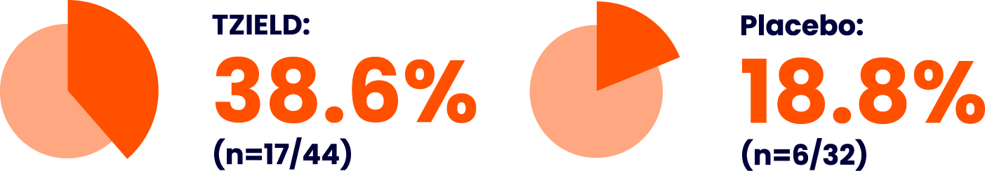 In an extended analysis of the TN-10 study, 38.6% of TZIELD-treated patients (n=17/44) remained in presymptomatic Stage 2 autoimmune T1D for 5+ years vs 18.8% of placebo-treated patients (n=6/32).§3