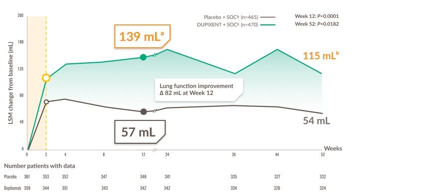 DUPIXENT + SOC provided sustained and clinically relevant improvementsf in lung functions vs placebo + SOC from baseline to Week 52
