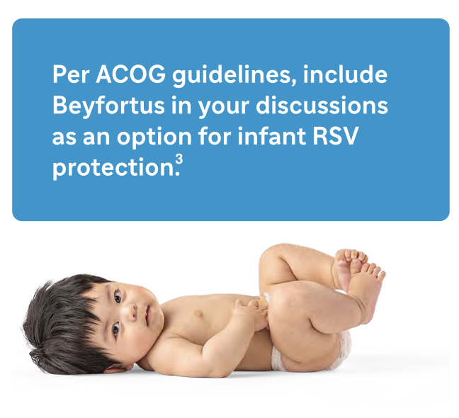 References: 1. Beyfortus (nirsevimab-alip). Prescribing Information. Sanofi. 2. Obando-Pacheco P, Justicia-Grande AJ, Rivero-Calle I, et al. Respiratory syncytial virus seasonality: a global overview. J Infect Dis. 2018;217(9):1356-1364. 3. Maternal respiratory syncytial virus vaccination. American College of Obstetricians and Gynecologists. Updated October 2025. Accessed January 14, 2026. https://www.acog.org/clinical/clinical-guidance/practice-advisory/articles/2023/09/maternal-respiratory-syncytial-virus-vaccination 4. Immunizations to protect infants. Centers for Disease Control and Prevention. Updated August 18, 2025. Accessed February 2, 2026. https://www.cdc.gov/rsv/vaccines/protect-infants.html 5. RSV immunization guidance for infants and young children. Centers for Disease Control and Prevention. Updated August 18, 2025. Accessed February 2, 2026. https://www.cdc.gov/rsv/hcp/vaccine-clinical-guidance/infants-young-children.html 6. Arriola CS, Kim L, Langley G, et al. Estimated burden of community-onset respiratory syncytial virus-associated hospitalizations among children aged <2 years in the United States, 2014-15. J Pediatric Infect Dis Soc. 2020;9(5):587-595. 7. RSV in infants and young children. Centers for Disease Control and Prevention. Updated August 30, 2024. Accessed January 14, 2026. https://www.cdc.gov/rsv/infants-young-children/index.html 8. Clegg L, Freshwater E, Leach A, et al. Population pharmacokinetics of nirsevimab in preterm and term infants. J Clin Pharmacol. 2024;64(5):555-567. 9. Jones JM, Fleming-Dutra KE, Prill MM, et al. Use of nirsevimab for the prevention of respiratory syncytial virus disease among infants and young children: recommendations of the Advisory Committee on Immunization Practices—United States, 2023. MMWR Morb Mortal Wkly Rep. 2023;72(34):920-925. 10. Recommended child and adolescent immunization schedule for ages 18 years or younger. American Academy of Pediatrics. Updated January 26, 2026. Accessed February 4, 2026. https://downloads.aap.org/AAP/PDF/AAP-Immunization-Schedule.pdf 11. Fleming-Dutra KE, Jones JM, Roper LE, et al. Use of the Pfizer respiratory syncytial virus vaccine during pregnancy for the prevention of respiratory syncytial virus–associated lower respiratory tract disease in infants: recommendations of the Advisory Committee on Immunization Practices—United States, 2023. MMWR Morb Mortal Wkly Rep. 2023;72(41):1115-1122. 12. RSV vaccine guidance for pregnant women. Centers for Disease Control and Prevention. Updated August 30, 2024. Accessed January 14, 2026. https://www.cdc.gov/rsv/hcp/vaccine-clinical-guidance/pregnant-people.html