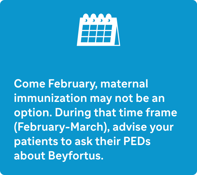 References: 1. Beyfortus (nirsevimab-alip). Prescribing Information. Sanofi. 2. Obando-Pacheco P, Justicia-Grande AJ, Rivero-Calle I, et al. Respiratory syncytial virus seasonality: a global overview. J Infect Dis. 2018;217(9):1356-1364. 3. Immunizations to protect infants. Centers for Disease Control and Prevention. Updated August 30, 2024. Accessed July 16, 2025. https://www.cdc.gov/rsv/vaccines/protect-infants.html. 4. Arriola CS, Kim L, Langley G, et al. Estimated burden of community-onset respiratory syncytial virus-associated hospitalizations among children aged <2 years in the United States, 2014-15. J Pediatric Infect Dis Soc. 2020;9(5):587-595. 5. RSV in infants and young children. Centers for Disease Control and Prevention. August 30, 2024. Accessed July 16, 2025. https://www.cdc.gov/rsv/infants-young-children/index.html 6. Clegg L, Freshwater E, Leach A, et al. Population pharmacokinetics of nirsevimab in preterm and term infants. J Clin Pharmacol. 2024;64(5):555-567. 7. Maternal respiratory syncytial virus vaccination. American College of Obstetricians and Gynecologists. Updated March 17, 2025. Accessed July 16, 2025. https://www.acog.org/clinical/clinical-guidance/practice-advisory/articles/2023/09/maternal-respiratory-syncytial-virus-vaccination 8. Fleming-Dutra KE, Jones JM, Roper LE, et al. Use of the Pfizer respiratory syncytial virus vaccine during pregnancy for the prevention of respiratory syncytial virus–associated lower respiratory tract disease in infants: recommendations of the Advisory Committee on Immunization Practices—United States, 2023. MMWR Morb Mortal Wkly Rep. 2023;72(41):1115-1122. 9. Jones JM, Fleming-Dutra KE, Prill MM, et al. Use of nirsevimab for the prevention of respiratory syncytial virus disease among infants and young children: recommendations of the Advisory Committee on Immunization Practices—United States, 2023. MMWR Morb Mortal Wkly Rep. 2023;72(34):920-925. 10. AAP recommendations for the prevention of RSV disease in infants and children. American Academy of Pediatrics. Updated July 8, 2025. Accessed July 16, 2025. https://publications.aap.org/redbook/resources/25379/AAP-Recommendations-for-the-Prevention-of-RSV 11. RSV vaccine guidance for pregnant women. Centers for Disease Control and Prevention. Updated August 30, 2024. Accessed July 16, 2025. https://www.cdc.gov/rsv/hcp/vaccine-clinical-guidance/pregnant-people.html 12. RSV immunization guidance for infants and young children. Centers for Disease Control and Prevention. Updated August 30, 2024. Accessed July 16, 2025. https://www.cdc.gov/rsv/hcp/vaccine-clinical-guidance/infants-young-children.html