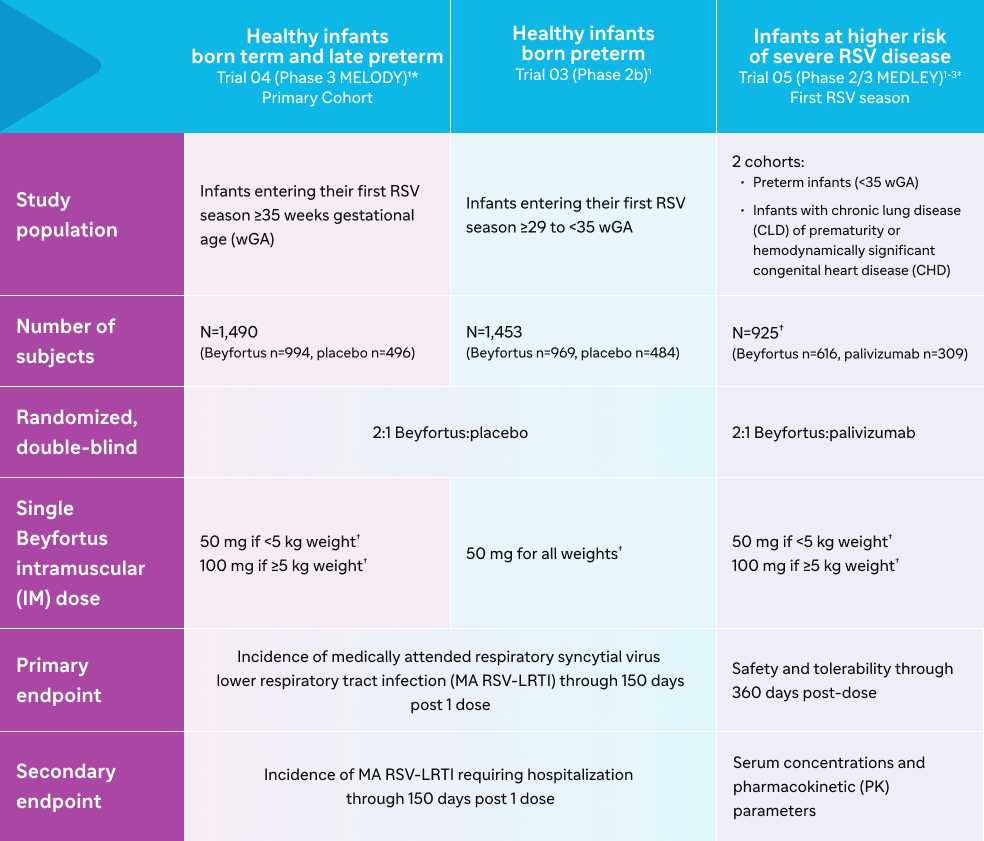 References: 1. Beyfortus (nirsevimab-alip). Prescribing Information. Sanofi. 2. Domachowske J, Madhi SA, Simões EAF, et al; MEDLEY Study Group. Safety of nirsevimab for RSV in infants with heart or lung disease or prematurity. N Engl J Med. 2022;386(9):892-894. 3. Domachowske J, Madhi SA, Simões EAF, et al; MEDLEY Study Group. Safety of nirsevimab for RSV in infants with heart or lung disease or prematurity. N Engl J Med. 2022;386(9)(suppl):892-894. 4. Muller WJ, Madhi SA, Nuñez BS, et al; MELODY Study Group. Nirsevimab for prevention of RSV in term and late-preterm infants. N Engl J Med. 2023;388(16)(suppl):1533-1534. 5. Hammitt LL, Dagan R, Yuan Y, et al; MELODY Study Group. Nirsevimab for prevention of RSV in healthy late-preterm and term infants. N Engl J Med. 2022;386(9):837-846. 6. Hammitt LL, Dagan R, Yuan Y, et al; MELODY Study Group. Nirsevimab for prevention of RSV in healthy late-preterm and term infants. N Engl J Med. 2022;386(9)(suppl):837-846. 7. Data on File. Sanofi. 8. Muller WJ, Madhi SA, Nuñez BS, et al; MELODY Study Group. Nirsevimab for prevention of RSV in term and late-preterm infants. N Engl J Med. 2023;388(16):1533-1534. 9. Griffin MP, Yuan Y, Takas T, et al. Single-dose nirsevimab for prevention of RSV in preterm infants. N Engl J Med. 2020;383(5):415-425. 10. Griffin MP, Yuan Y, Takas T, et al. Single-dose nirsevimab for prevention of RSV in preterm infants. N Engl J Med. 2020;383(5)(suppl):415-425. 11. Hsiao A, Hansen J, Fireman B, et al. Effectiveness of nirsevimab against RSV and RSV-related events in infants. Pediatrics. 2025;156(2):e2024069510. 12. Drysdale SB, Cathie K, Flamein F, et al; HARMONIE Study Group. Nirsevimab for prevention of hospitalizations due to RSV in infants. N Engl J Med. 2023;389(26):2425-2435. 13. Moline HL, Toepfer AP, Tannis A, et al; New Vaccine Surveillance Network Collaborators. Respiratory syncytial virus disease burden and nirsevimab effectiveness in young children from 2023-2024. JAMA Pediatr. 2025;179(2):179-187. 14. Moline HL, Toepfer AP, Tannis A, et al; New Vaccine Surveillance Network Collaborators. Respiratory syncytial virus disease burden and nirsevimab effectiveness in young children from 2023-2024. JAMA Pediatr. 2025;179(2)(suppl):179-187.