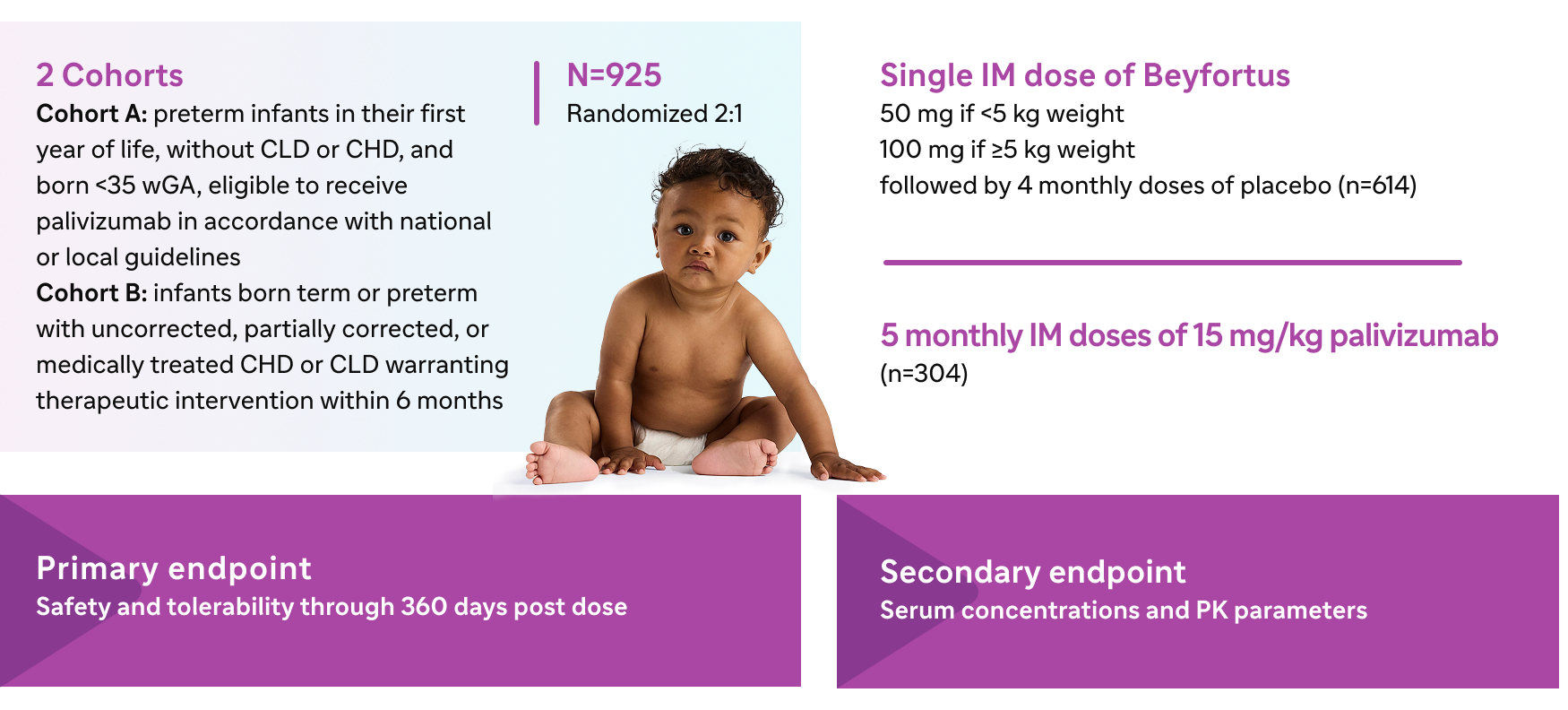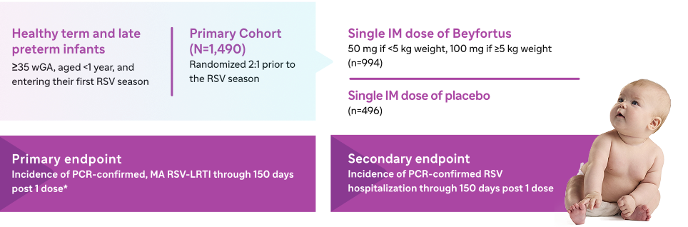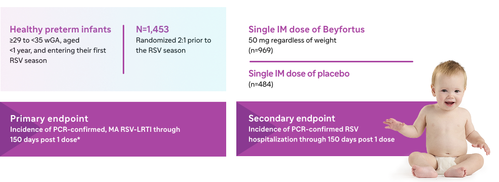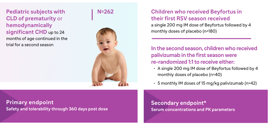 *Trial 05 was a Phase 2/3, randomized, double-blind, palivizumab-controlled study evaluating the safety of Beyfortus in infants with CLD or CHD and preterm infants (<35 wGA) entering their first RSV season. Children up to 24 months with CLD or CHD could continue in Trial 05 and receive Beyfortus or palivizumab prior to their second RSV season.1