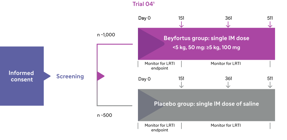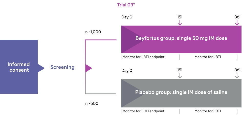 - Efficacy was established based on extrapolation of efficacy from Trials 04 and 03 to the population enrolled in Trial 05, based on similar Beyfortus exposures among infants enrolled in Trials 04 and 05